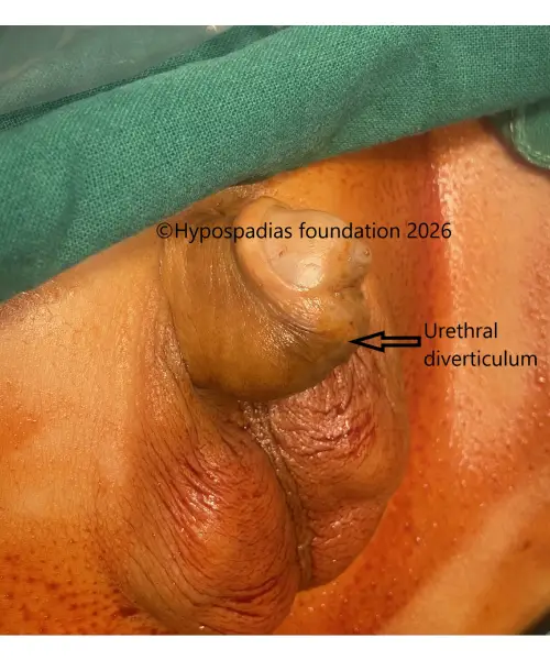 In some cases, a pouch (diverticulum) forms along the reconstructed urethra, causing it to bulge during urination. This can lead to urine collecting in the pouch, resulting in post-void dribbling or leakage after urination. Parents may notice a swelling on the underside of the penis while the child urinates. If the diverticulum is significant or causes symptoms, redo urethroplasty may be required.